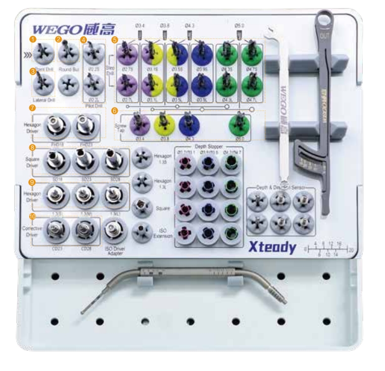 本套器械為Xteady牙種植體系統(tǒng)專(zhuān)用外科種植手術(shù)器械,采用顏色標(biāo)記的設(shè)計(jì),讓手術(shù)流程一目了然;整套器械由瑞士專(zhuān)業(yè)牙科工具供應(yīng)商制造,加工精良,設(shè)計(jì)合理,精確耐用;滅菌盒可反復(fù)高溫壓力滅菌,便于清洗,內(nèi)置配件盒,方便器械滅菌與使用。
